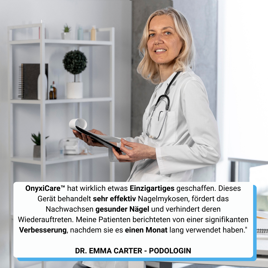 Die meisten Nutzer sehen sichtbare Ergebnisse nach 3 bis 5 Wochen täglicher Anwendung. Die Nägel werden heller, die Schmerzen verringern sich und das gesunde Wachstum des Nagels ist sichtbar. Für eine vollständige und dauerhafte Behandlung schwerer Infektionen wird empfohlen, OnyxiCare Pro™ 3 bis 6 Monate zu verwenden, je nach Schwere der Infektion.